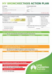 When completed with a health professional, the Bronchiectasis Action plan helps you recognise early symptoms of a flare-up (exacerbation) and outlines the actions you should take to help manage it. This resource also helps your family members know what actions you need to take in an emergency.