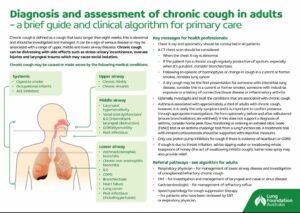 This clinical guidance tool provides an overview of definitions, causes and risk factors and prevention of chronic cough in adults. The diagnosis and assessment of chronic cough in adults –clinical algorithm provides clear step-by-step, evidence-based recommendations supplemented with key messages for primary health care professionals on how to assess and manage patients presenting with chronic cough.