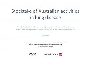 This document provides a comprehensive account of current Australian activities in lung diseases. The lung diseases encompassed in this stocktake include asthma, Chronic Obstructive Pulmonary Disease (COPD), bronchiectasis, Interstitial Lung Disease, Pulmonary Fibrosis, Cystic Fibrosis, lung cancer, Occupational Lung Disease, Obstructive Sleep Apnoea and tuberculosis.
