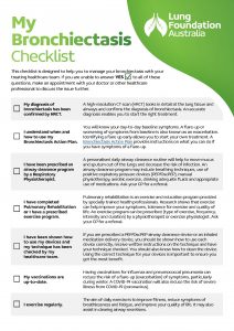 The My Bronchiectasis checklist summarises key self-management activities to help you manage your Bronchiectasis in accordance with evidence-based guidelines. The My Bronchiectasis checklist is a template to be completed by you in conjunction with your GP or specialist to outline your plan for self-management.